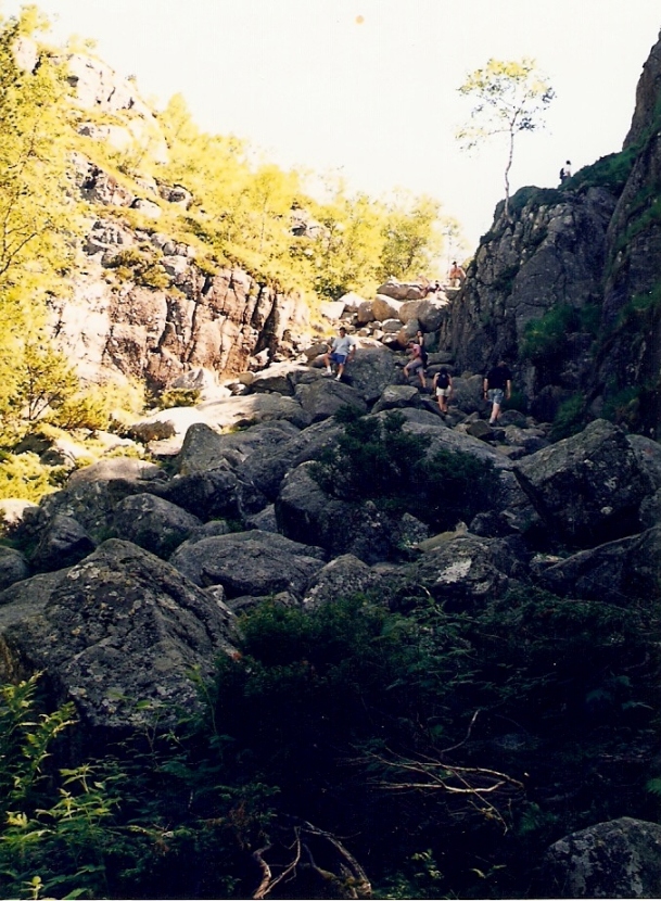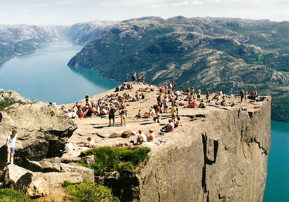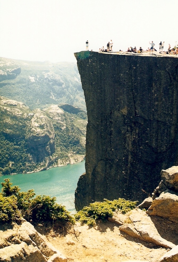 Ráno opět „pařák“, před polednem již stojíme na parkovišti před Preikestolenem. Dvouhodinový vražedný výstup zpestřený jezírky, močály a různými skalními útvary odměněn překrásným výhledem na Lysefjord. Nejlepší pohled je z Kazatelny. Pohled do příkré šestisetmetrové vodní strže pod vámi bez jakéhokoliv zábradlí ve vás zcela jistě vyvolá pud sebezáchovy. Cesta zpátky se dá zvládnout za půldruhé hodiny. Večerní chlad zachraňoval částečně alkohol.