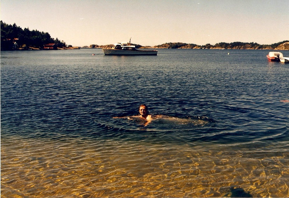 Ráno se probouzíme v rozhicovaném stanu. Po pár minutách se už plácáme na písečné pláži u moře. Teplota moře kolem 16°C sice nic moc, ale chvilku se to vydržet dá. Ovšem pozor na některé žahavé medúzy, které otce poznamenaly popálením na rukou a nohou, když se je snažil hrdinsky přihnat ke břehu. Skandinávské sluníčko jsme silně podcenili – spálené nohy a záda o sobě dávaly další den dost vědět.