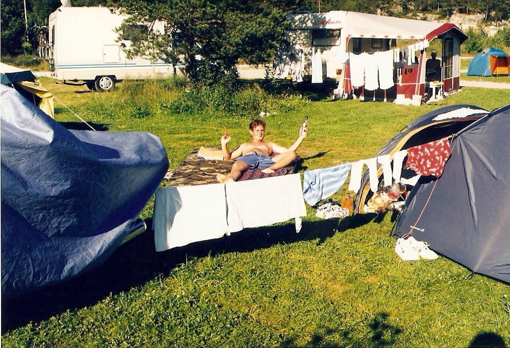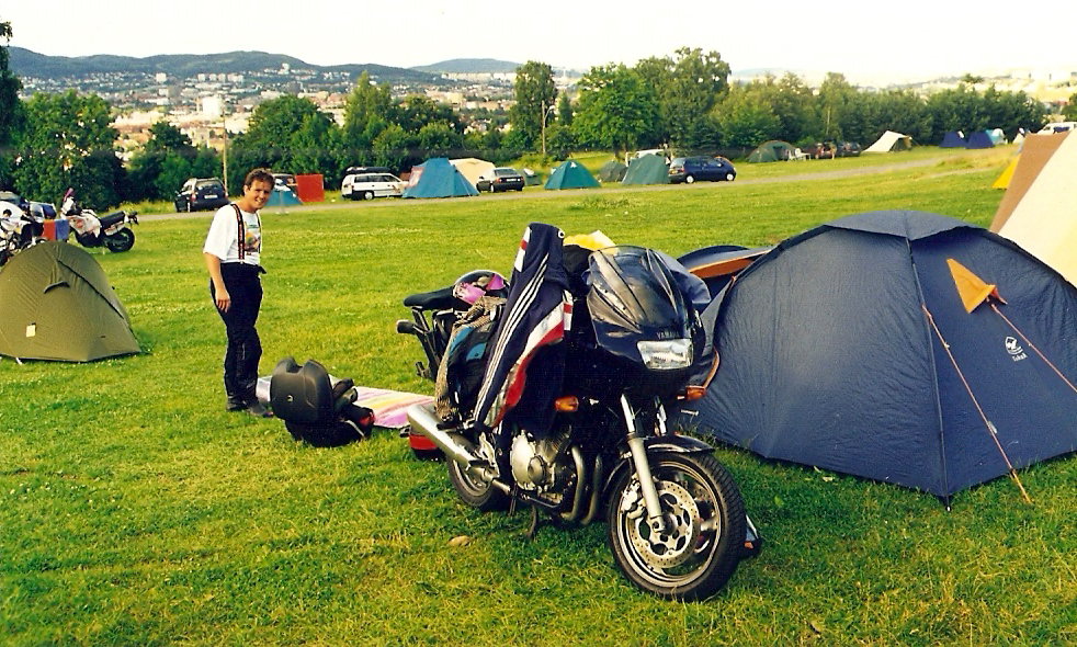V 21:00 se poprvé dotýkáme v městě Kristiansand norské půdy. Motorka couvla v lodi asi o 20 cm, ale jinak vše v pořádku. Slunce si zatím vesele svítí. Rychle jedeme po pobřeží najít nějaký kemp. U městečka Aros takový jeden krásný je. Okamžitě odbočujeme a stavíme stan. Teplá voda se opět platí – 10 NOK za 7 minut sprchy.