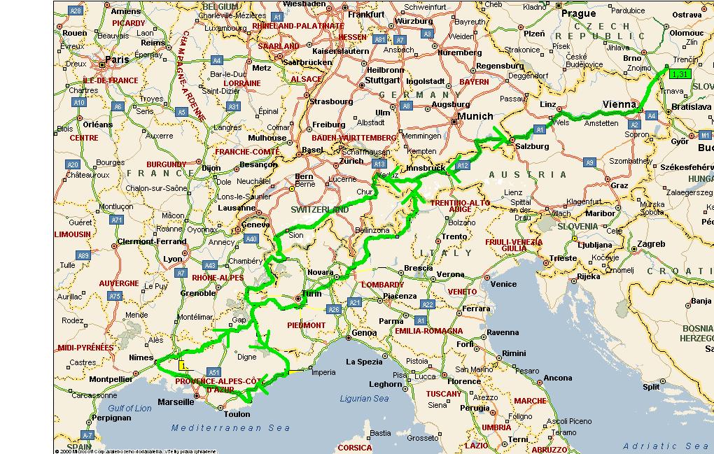 Všichni se tu shodují že chcou jet do Alp, tkže zůstanu u mojí dříve navrhované trasy: to je přesun po rakouských a něměckých dálnicích do Churu, projet napříč švícarskem do Martigny. Odtud přes nejvišší alpské sedla (11 sedel s výškou přes 2000m) na jih k moři do Monte Carla: knížecí palác, Casíno, okruch F1. Pak přesun po francouské dálnici do Saint Tropéz a dál do Nimes: (staré římské město) Aréna, Masion Carree, Dianin Chrám.Avignon: Pont du Gard (starý akvadukt), Papežský palác, Pout St-Benézet (most do poloviny řeky).Dále z Avignonu na vrchol Mont Ventoux a pak směr Itálie.Návštěva vojenské pevnosti na italských hranicích. V Itálii pak vykopávky a přes Lago Como k průsmyku Paso de Stelvio . Pak už směrLandeck a k domovu.