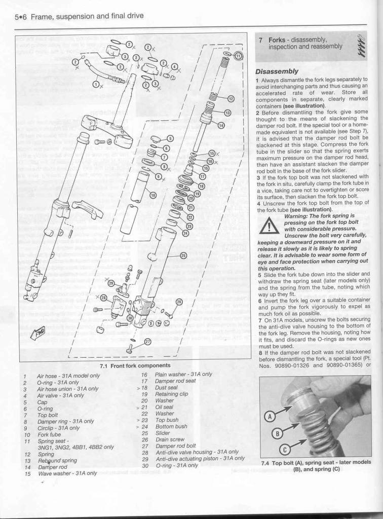 jednoznacne su tam dva klzne kruzky, jeden v hlinikovom klzaku (vrchny) a jeden dole na chromovanej piestnici(spodny). V mikrofichoch 58L nie je nakresleny, ale nechapem, ako mozu byt na expandovanom obrazku v Haynes prirucke na strane 105 spravne aj zakreslene aj popisane. (bottom a upper bush) polozky cislo 23 a 24.